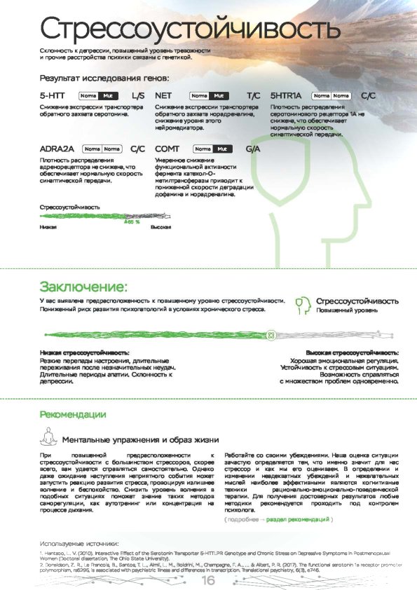 Этот ДНК анализ показывает влияние наиболее важных 10 генов на психическое и эмоциональное состояние. Именно они регулируют выработку гормонов, работу нейромедиаторов. Используйте знания о природных свойствах своего организма для борьбы со стрессом, повышения работоспособности и общего тонуса. Каждый человек индивидуален, поэтому мы рекомендуем пройти наш генетический нейро тест в Тырныаузе.